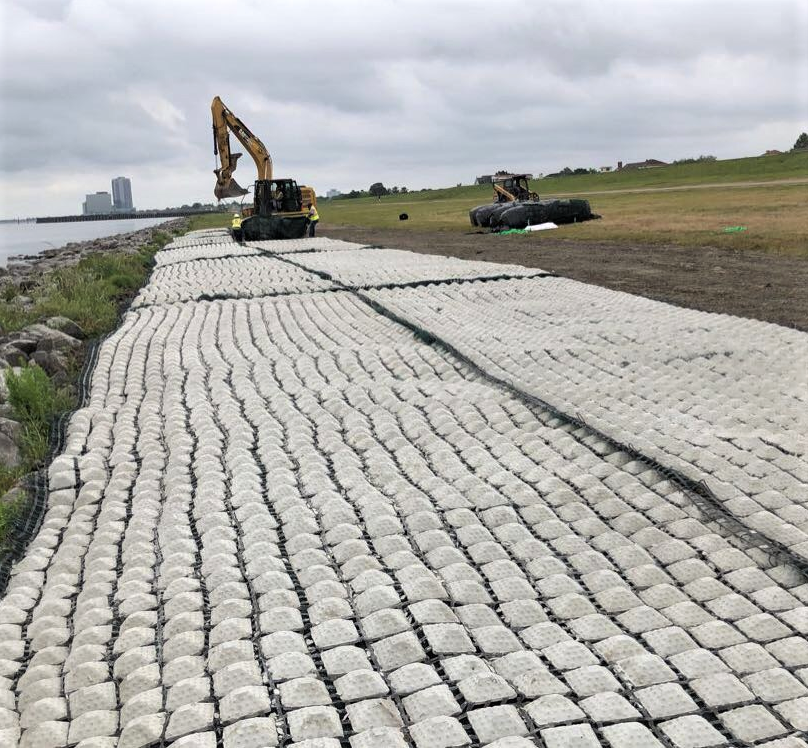 Durr’s work on the East Jefferson Levee District Reach 1 & Reach 3 project included filling and installing multiple erosion control projects for seven different pilot test sections, located on the Lake Pontchartrain levee in Jefferson Parish. These test sections included plantings, concrete block mats, and fabrics with seed, as well as high-performance mulches. Following the completion of the installation phase, Durr worked to maintain these test sections, which included watering the plantings daily.